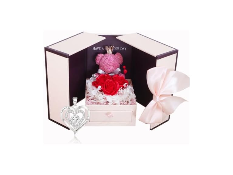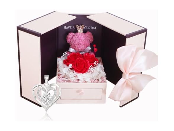 - A gift for her: The double-door gift box presents a cute little bear and complete flowers. Don't worry, the roses will not wither and the gift box will be preserved as new.