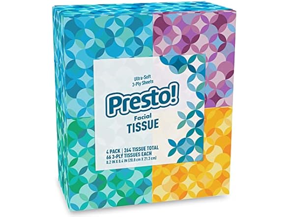 - IN THE BOX: 4 Cube Boxes of facial tissues with 66 3-ply tissues in each box (264 total)