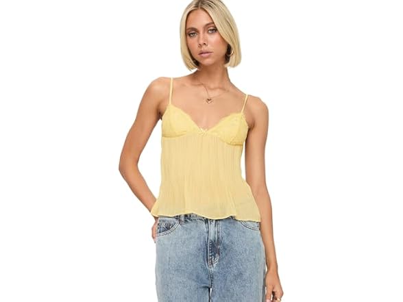 - (1) Princess Polly Zami Lemon Yellow Sheer Mesh Lace Detail Plunging Pleat Top