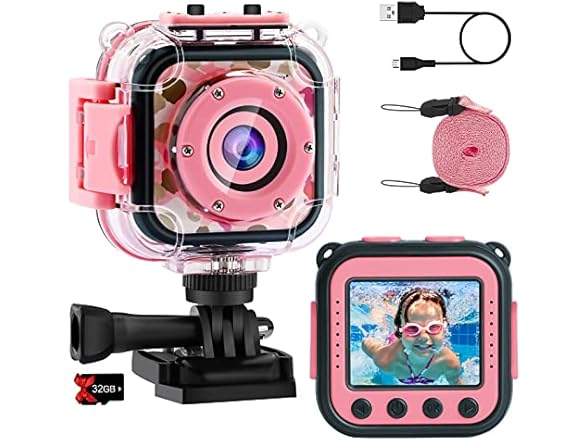 - Ultra-Compact & Fully Loaded - Small hands, big features! This kids pool toys comes fully loaded with a 32GB SD card, 100ft waterproof case, USB cable, and adjustable straps. Weighing less than a juice box, it's the most portable waterproof camera for kids ages 3-12, ready for any sport or trip without the bulk.