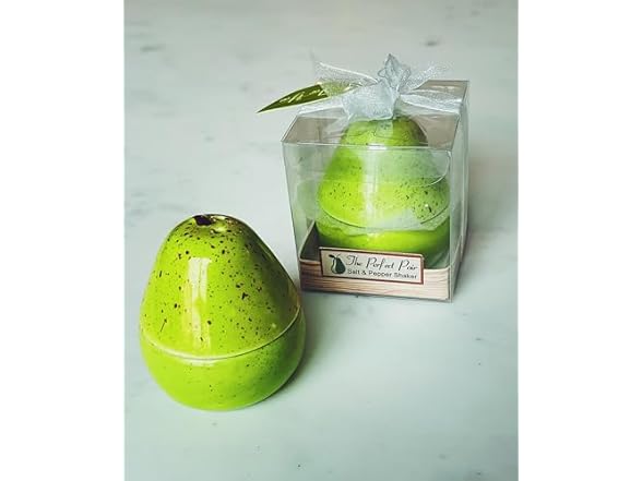 - 🍐 Decorate your table with this salt and pepper set; This uniquely designed dish is elegant enough to be used for the holidays, yet durable enough to be used every day. This salt and pepper shaker set has a reusable design and is suitable for modern and farmhouse style kitchens, dining rooms and tables. Textured shakers in the shape of a green pear.