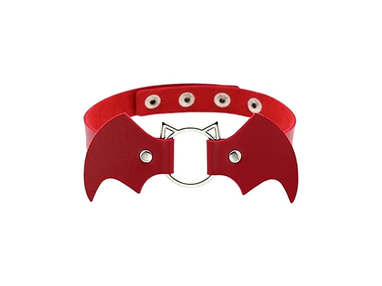 - (1) COLORFUL BLING Punk Demon Wings Black Leather Choker Necklace Gothic Pu Leather Cute Cat Head Ring Choker Rock Collar for Women-Red