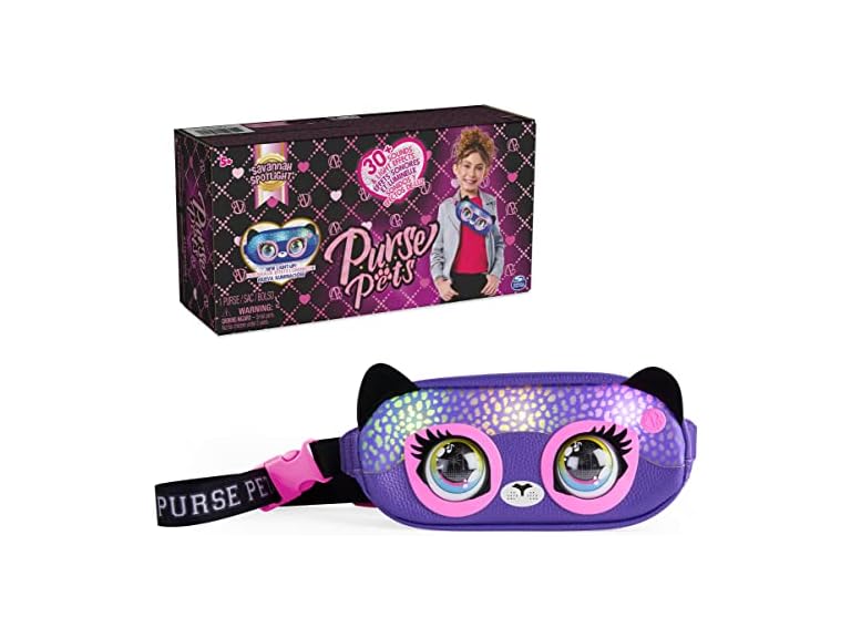 Light up your look with the Purse Pets Savannah Spotlight belt bag! This fabulous and functional interactive Purse Pets girls purse is packed with stylish features. She responds to your touch, has multicolor light-up cheetah spots and over 30 exciting sounds and light effects! Savannah Spotlight features beautiful details including pebbled faux leather accents, amped up expressive eyes, a metal zipper, and an adjustable printed Purse Pets strap to wear your way. When you’re out and on-the-glow, she makes sassy sounds as she interacts with you and her spots continuously light up in a rainbow waterfall effect. Tap her head to speed up the color change or hold and release to choose a solid color that matches your look! In Rainbow Rave, discover Savannah Spotlight’s beats. With five songs, this trendy cheetah has more music than any other Purse Pets! As she plays music, her colored lights animate – touch her head to change songs and hold her head to add your own sounds for the ultimate dance party! It’s so much fun! Want to know your style mood? In Disco Destiny, Savannah Spotlight predicts it with cute sounds and more light effects! Hold her head and release to reveal her mood prediction: orange and yellow lights for playful, white for dreamy, purple and pink for glam and so much more! With Savannah Spotlight, rave meets runway! Adjust her strap and wear Savannah Spotlight as a cross body bag, over the shoulder or around the waist. Customize your belt bag with a Luxey Charms character (sold separately) for the ultimate Purse Pets mashup! Measuring approximately 3.5 in. (H) x 10 in. (W) x 2.4 (D), the Savannah Spotlight kids purse has room inside for your favorite essentials. Requires 3 AAA batteries (not included). Purse Pets interactive toys for kids are great birthday gifts, Christmas gifts, stocking stuffers or gifts for 5 year old girls and up for any occasion. Make a showstopping statement anywhere you go with the Purse Pets Savannah Spotlight belt bag!