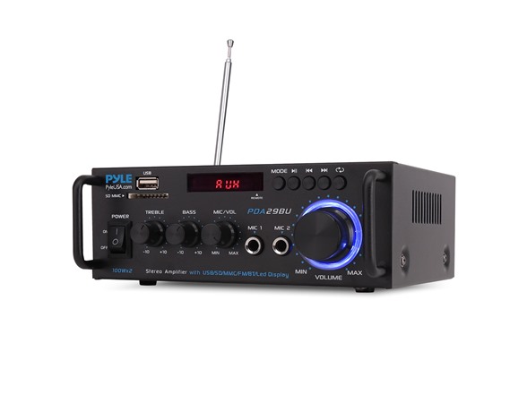 - (1) Pyle 200W Bluetooth Compact Power Amplifier - Wireless 2 Channel Audio Receiver with Dual Karaoke Mic Input - RCA - USB-A + SD Card MP3 Player - FM Radio - AUX In - Remote Control - PDA29BU