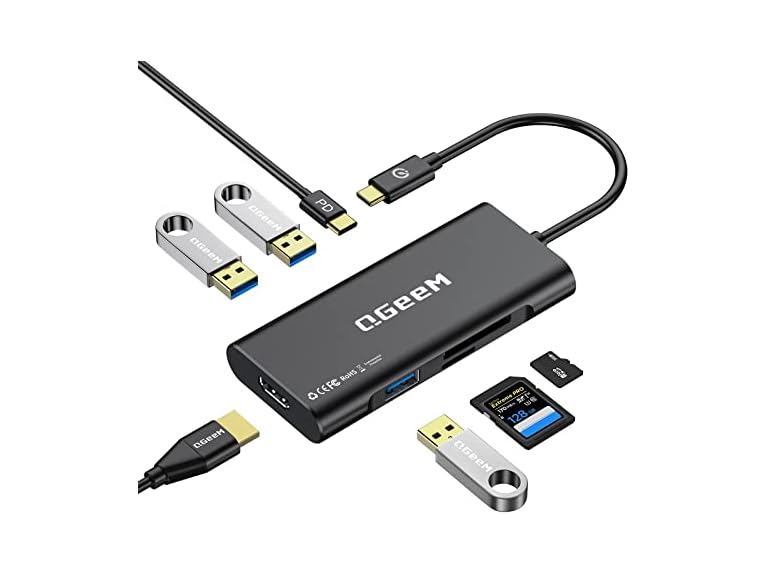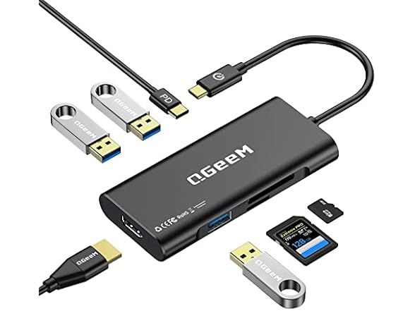 - QGeeM Smart USB C Hub: Plug and play, no drivers required, get more out of your laptop's USB-C port with 4K@30Hz HDMI, SD/TF card connectivity, USB 3.0 x3 data port, and high-speed pass-through charging with 100W Power Delivery.This usb c to hdmi hub is the perfect combination of all the features you need and save your desk space and expand your devices connectivity