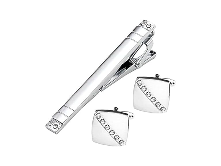 - MATERIAL—This Mens Cufflinks and Tie Clip Set is made out of brass and plated in a polished rhodium for strength and durability.These sturdy cufflinks are able to withstand the effects of denting and fading,So they stay looking like new,Even after continual use.