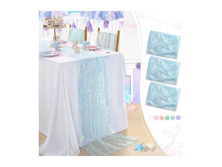 - Blue sequin table runner: our iridescent party table linens is embedded with glitter sequins just like mermaid scales , which is shiny and full of exquisite feeling, easy to match event styles and make more eye-catching, will add a lively touch to your dining table