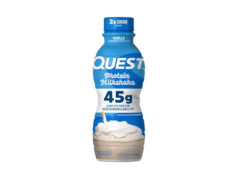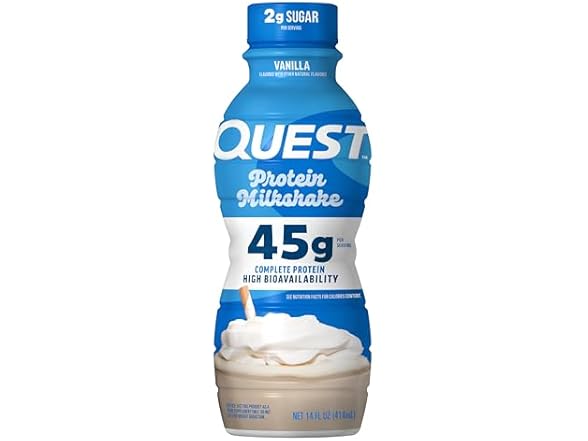 - (1) Quest Nutrition Protein Milkshake, Vanilla, 45g Protein, 2g Sugar, High Protein, Low Sugar, Gluten Free, 1 Count
