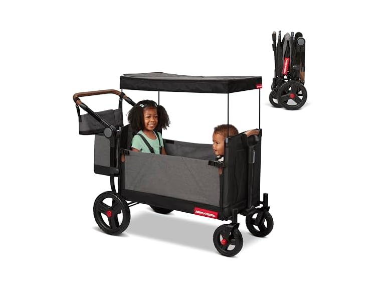 - 3 Wagons in 1: These carts with wheels offer 3 different modes – two rider seating, hauling, and bench seating mode. The sides of the Atlas Stroll ‘N Wagon zip down for stationary bench seating or easy entry, perfect for picnics, parks, and family outings.