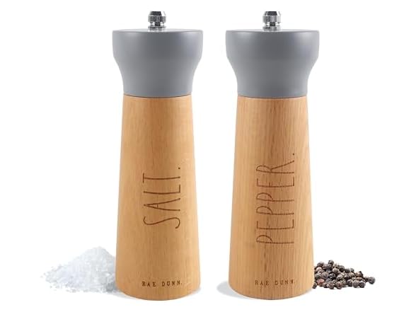 - Rae Dunn Style in Your Home - This salt grinder and pepper grinder set is a modern, classy and user friendly addition to your kitchen. great for a gourmet meal or dinner party, they are so decorative as well. Great present or party favor! *SALT AND PEPPER NOT INCLUDED.