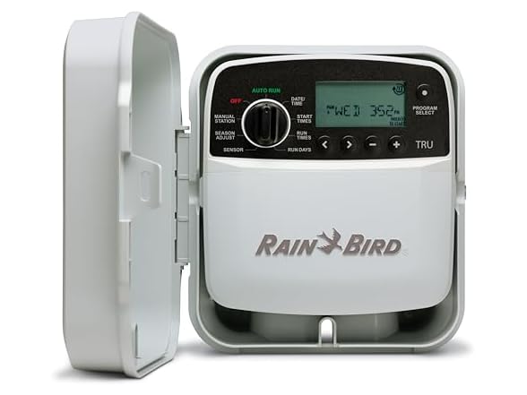 Rain Bird TRU8O Program-Based Indoor/Outdoor Irrigation Controller/Timer, WiFi Ready, 8-Zone/Station. Take control of your landscape with the versatile Rain Bird TRU8O irrigation controller. Flexible program-based settings enable specialized watering schedules for each area of your yard. Designed for residential applications with professional features, and reliability. Easy-to-set with an intuitive programming dial and multi-function LCD display. Quickly upgrades to remote WiFi-based, mobile device operation (Apple iOS or Android) by inserting a Rain Bird LNK2 WiFi Module (sold separately). Features individual A, B, C programs per zone with up to (4) start times per program for a total of (12) distinct start times per zone. Controls up to (8) valves with watering duration options from 1-minute to 6-hours. Simply turn the dial to select and easily program the wide range of functions displayed on the LCD screen. Automatic Watering: customizable by days of week, odd or even calendar days, or cyclic every 1 to 30 days. Manual Station: allows watering of a single zone, all zones, or an individual program. Season Adjust: increase or decrease watering times by 5% - 200% on all programs at once, or by individual programs. Rain Delay: manually suspends and resumes watering for 1 to 14-days,or operates a rain sensor (sold separately) for automatic delays and restarts. Permanent Days Off: sets a regular day, or days off by program so watering never occurs during scheduled landscaping crew visits. No need to reprogram in case of power outages…non-volatile memory permanently saves current programming, and a built-in lithium battery maintains time and date. Professional Programming Features: interstation delay from 1-second to 9-hours, rain sensor bypass by zone, save/restore programming, control zone by master valve or pump start relay, and reset to factory defaults. Built-in surge protection guards against damage from lightning strikes and power surges. Automatically troubleshoots valves and suspends watering to the affected zone while displaying a warning message identifying the valve number. Preinstalled in a weatherproof, contractor-grade case to withstand even the harshest environments. Compatible with most 24 VAC irrigation valves. Includes transformer power plug, 6’ power cord, and User Manual. Robust set screw terminals for AC power, valve connections, master valve/pump start relay and rain/rain freeze sensor. Meets EPA WaterSense criteria when paired with LNK2 WiFi Module and a rain sensor (sold separately). External Power Supply Rating: Input: 120V∿ (±10%) at 60 Hz; Output: 24V∿ at 60Hz, 0.750 A. Certifications: UL/ULC LISTED 273J; FCC Part 15b; CAN ICES-003(B)/NMB-003(B); IP24. Storage Temperature Range: -40°F (-40°C) to 150°F (66°C). Operating Temperature Range Maximum: 149°F (65°C). Operating Humidity: 95% max at 50°F to 120°F (10°C to 49°C) non-condensing environment. Rain Bird “The Intelligent Use of Water”