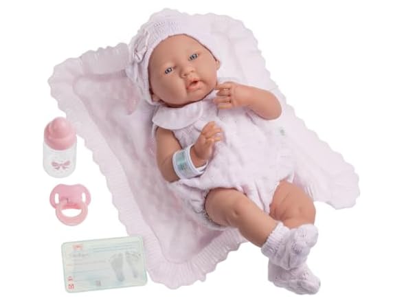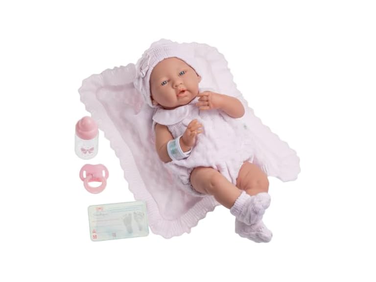 The La Newborn Collection of Real Life Baby dolls introduces its newest addition. Dressed in a beautiful pink knit set, our La Newborn is as sweet as can be. This precious La Newborn features a new delightful expression and striking baby blue eyes that are sure to melt your heart! She is a 15” all-vinyl Anatomically Correct “Real Girl” with moveable arms, legs, and head. She is made completely out of vinyl for easy care. This sweet little girl is all dolled up in a cute pink knit romper, matching chic cloche hat, and booties. This amazing set also includes a matching knit blanket, so your child can swaddle her to keep her cozy and safe. The La Newborn collection of baby dolls were hand-designed in Spain by the Designed by Berenguer team, an award-winning group of the world’s best doll designers. Every La Newborn was originally hand-sculpted by a doll design specialist, so the quality level is beyond anything you’ve ever seen. Dolls from the La Newborn collection represent precious moments in a newborn’s life, like the first tired yawn or teardrop. This La Newborn baby doll, the Nursery, flawlessly imitates that once-in-a-lifetime leaving the hospital experience thanks to her intricately detailed dimples, folds, life-like wrinkles, and 8-piece layette gift set. People all over the world love our dolls for all kinds of reasons. Baby dolls encourage social interaction as well as fine-motor development in children. Dolls also help you introduce an upcoming new baby in the family to a young child. Children especially love baby dolls because of the infinite amount of playtime possibilities. The Nursery La Newborn is manufactured directly by our company, JC Toys, a world leader in doll manufacturing. JC Toys is a family run and operated business with origins dating back to 1982 in south-east Spain - one of the top major toy-making and design centers in the world. Today, you can find 100s dolls, playtime accessories, and more by JC Toys. Add smiles to a young child’s face today by adding this Nursery La Newborn to your cart now, so it can be ready for checkout and shipment asap - thank you!