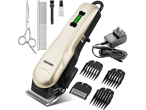 - 【Powerful Dog Hair Clippers】AIBORS dog grooming are constructed with high carbon blades to stay sharp, equipped with heavy-duty gears for proper powerful cutting with stable control.R-shaped anti-clogging blades can easily cut through thick coats or fine fluff, creating a hassle-free cutting and enjoyable experience for your pet.