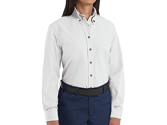 - FEMININE FIT. Short-sleeves with box pleat styling, wood tone buttons, and a feminine fit make this the perfect dress shirt for any occassion.