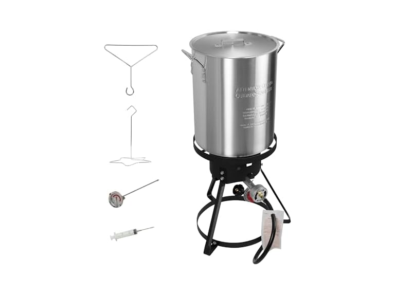- Set Content: Including 30 Qt. Stock Pot, a 5 PSI CSA certified regulator, a Temperature Thermometer, Perforated Turkey Rack, Lifting Hook, Marinade Injector, Burner Stand, LP Hose.