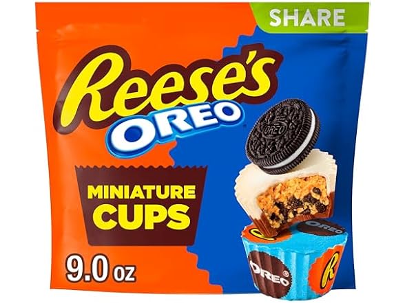 - Contains one (1) 9-ounce share pack of REESE'S OREO Miniatures Milk Chocolate and White Creme Peanut Butter Cups Candy