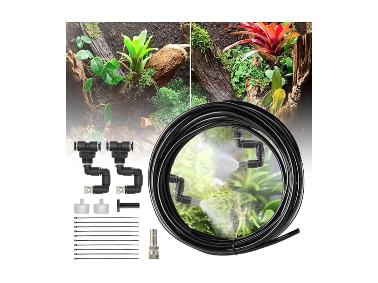 - Wide Range of Applications: This kit is perfect for reptiles such as chameleons, lizards, turtles, frogs, and snakes. It also helps create rainforest environments, providing misting, humidifying, and cooling. Additionally, it’s suitable for outdoor water play areas like trampolines, water parks, swimming pools, animal enclosures, umbrellas, and shade sails.