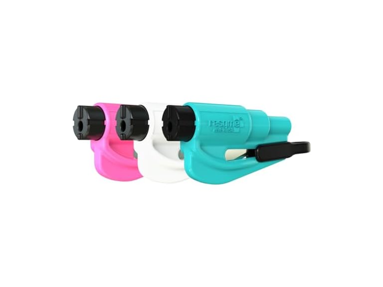 - (1) RESQME The Original Emergency Keychain Car Escape Tool, 2-in-1 Seatbelt Cutter and Window Breaker, Made in USA, Family Pack of 3, Pink, White, Teal - Compact Emergency Hammer