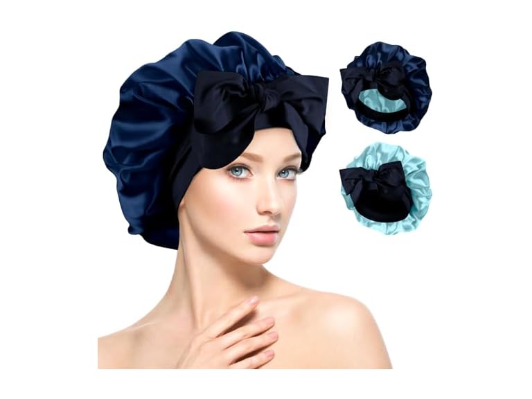 - Reversible Satin Bonnet for Sleeping Women, Double Layer Soft Ajustable Elasticity Band Satin Bonnet for Sleeping Hair Silk Sleep Cap Reduce Frizz (Navy Blue + Blue)