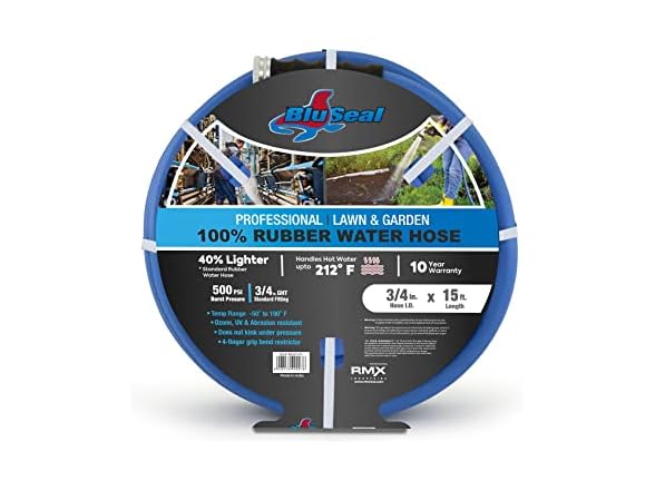 - BluSeal Hot/Cold Water Rubber Garden Hose, 100% Rubber, Ultra-Light, Super Strong, 500 PSI, 50F to 190F Degrees, High Strength Polyester Braided (3/4" x 15')