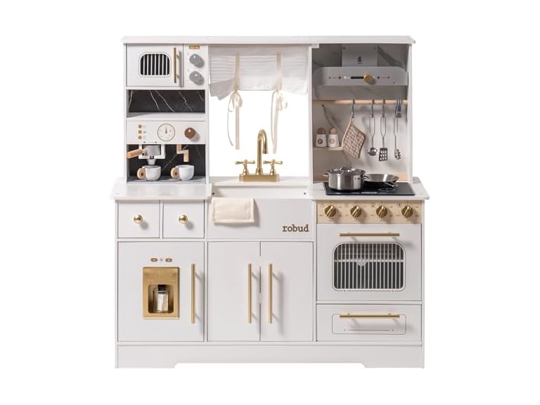 - REALISTIC DESIGN, SPARK CREATIVITY: The ROBUD White & Gold Deluxe Kids Kitchen Set features exquisite design and details like a real faucet, coffee machine, oven, and utensils, providing the most lifelike kitchen play experience to ignite your child's creativity and imagination.
