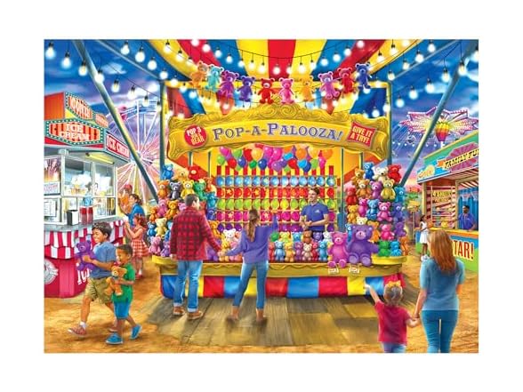 - NOSTALGIC CARNIVAL: RoseArt Bigelow Country Fair Games 1000 Piece Jigsaw Puzzle captures the essence of a bustling carnival game, Pop-A-Palooza!, where players aim to pop balloons to win charming stuffed teddy bears