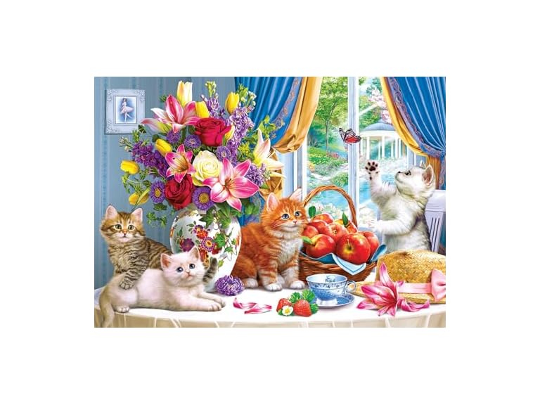 Delight in the adorable charm of RoseArt's Kodak Premium "Fluffy Kittens in the Living Room" 3000-Piece Jigsaw Puzzle. This heartwarming puzzle features a cozy living room scene with playful, fluffy kittens lounging, exploring, and getting into mischief — a perfect image for cat lovers and puzzle enthusiasts alike. Made with high-quality European puzzle board, each piece fits together with a satisfying snap, ensuring a smooth and enjoyable puzzling experience. The finished puzzle size of 42" x 30" offers a rewarding challenge for those who love intricate, large-scale puzzles. Perfect for family fun time, this puzzle offers hours of entertainment as everyone can join in to complete the delightful scene. It also makes a great gift for cat lovers, puzzle fans, or anyone who enjoys capturing the joy and warmth of home. A bonus puzzle poster is included to help guide you through assembling this charming image. Whether you're building it solo or with family, RoseArt's Kodak Premium "Fluffy Kittens in the Living Room" provides both a satisfying challenge and a heartwarming experience. Order now to bring these playful kittens into your home and enjoy a fun, relaxing puzzle adventure — one satisfying piece at a time!