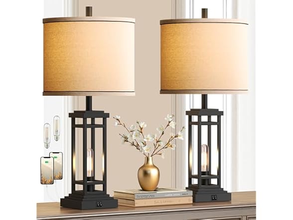 - (1) ROTTOGOON 27.5 Tall Farmhouse Table Lamps with USB C + USB A Charge Ports, Rustic Living Room Lamps Set of 2, Black Industrial End Table Lamp for Bedroom Living Room Nightstand (Black)