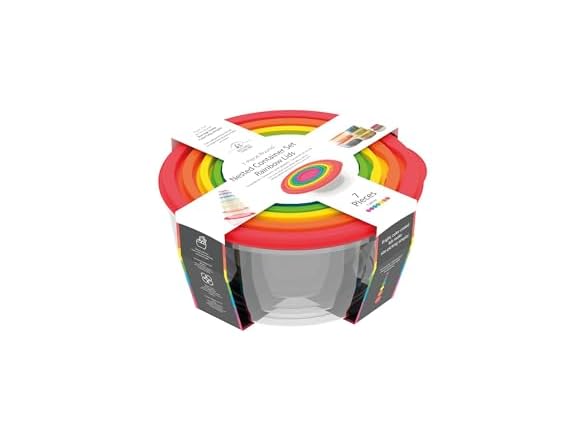 - Includes 7 Round Containers with Rainbow Lids — Sizes: 7 oz (230 ml), 13 oz (380 ml), 22 oz (650 ml), 37 oz (1.1 L), 60 oz (1.8 L), 108 oz (3.2 L), and 166 oz (4.9 L)