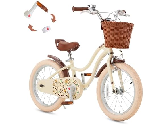 - (1) RoyalBaby Girls Bike, Stargirl EZ Kids Bike Balance and Pedal Bicycle with Basket and Dual Handbrake, 18 Inch Toddlers to Big Kids 5-8 Years, Cream Brown