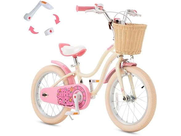 - (1) RoyalBaby Girls Bike, Stargirl EZ Kids Bike Balance and Pedal Bicycle with Basket and Dual Handbrake, 16 Inch Toddlers to Big Kids 4-7 Years, Cream Pink