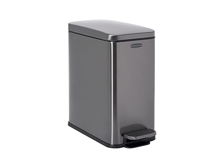 - Rubbermaid Stainless Steel Slim Step-On Trash Can, 2.6-Gallon, Charcoal, Wastebasket with Lid for Home/Bathroom/Kitchen
