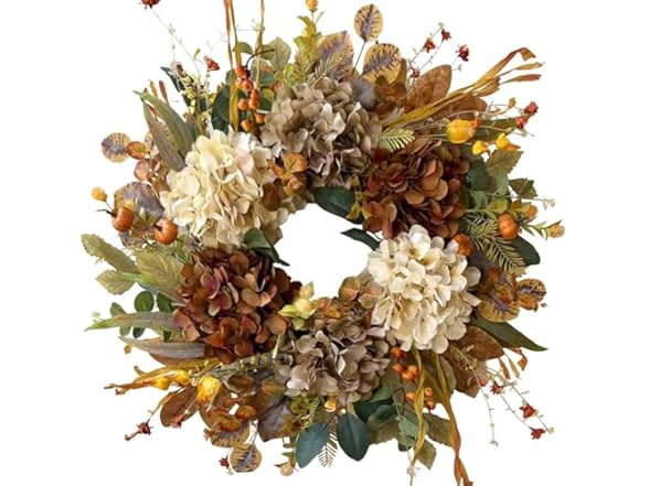 - ①【Grand Size】 This large 24 - inch fall wreath features a lush arrangement of creamy white and earthy brown hydrangeas, complemented by vibrant autumn leaves, orange berries, and delicate foliage. The rich, warm color palette (including shades of brown, green, yellow, and orange) captures the essence of fall, making it a striking focal point for any space.