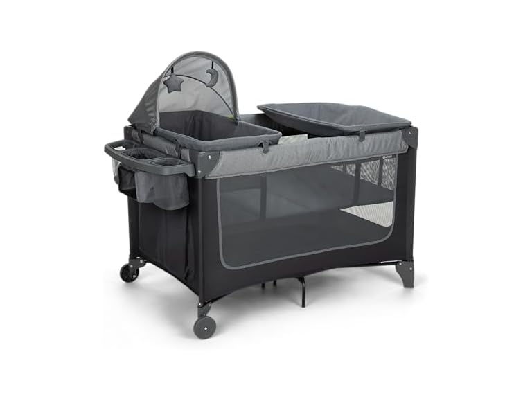- FOLDABLE AND PORTABLE PLAYPEN This 4-in-1 travel play yard and bassinet includes two wheels for ease of movement around the house. When not in use, it folds up for convenient storage and includes a carry bag for easy travel.