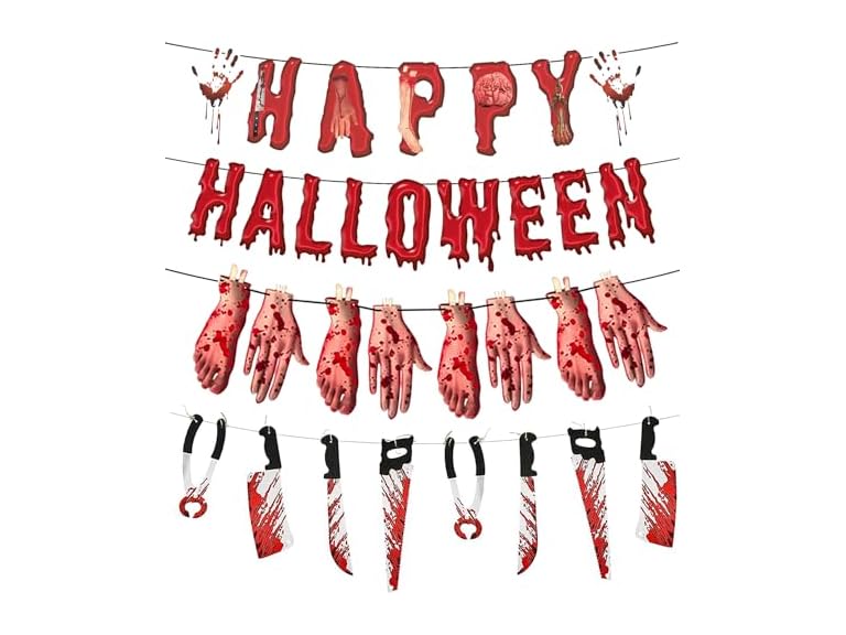 - Horror Decor Kit - contains weapons, knives, axes, hacksaw, pliers, bloody hand prints, hands, feet and HAPPY HALLOWEEN banner, these blood splattered horror props can easily turn any room into a chilling horror movie scene. Whether you want to spook your guests or create a bone-chilling backdrop for photos, bloody banners will bring an extra dose of terror to your Halloween party.