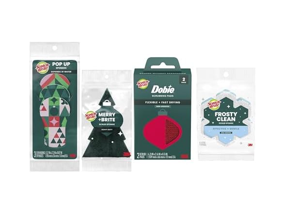 - SEVEN SCRUBBING SPONGES: The Scotch-Brite Merry + Brite Heavy Collection features three Scotch-Brite Compressed Pop-Up Sponges, one Scotch-Brite Heavy Duty Pine Tree Shaped Sponge, two Scotch-Brite Dobie Scrubbing Pads in Red and one Scotch-Brite Snowflake Non-Scratch Scrub Sponge