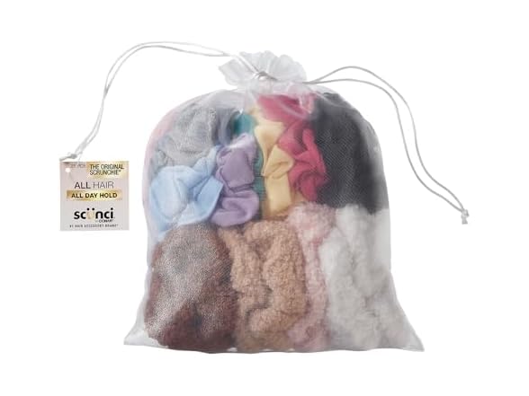 - 25-PIECE SCRUNCHIE SET: Mixed fabric scrunchies come with a mesh drawstring storage bag