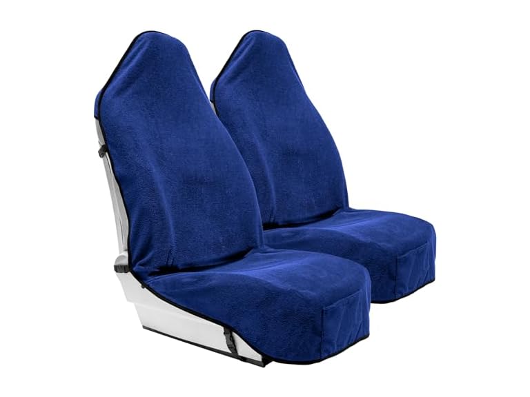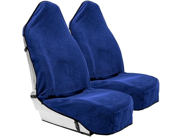 - (1) Season Guard Terry Cloth Sweat Towel Seat Cover; Carseat Towel Protector; Great for Gym Workout; Waterproof; Universal Fit for Car SUV Van Truck; EZ fit; Non Slip Grip; Machine Washable; 2pc Blue