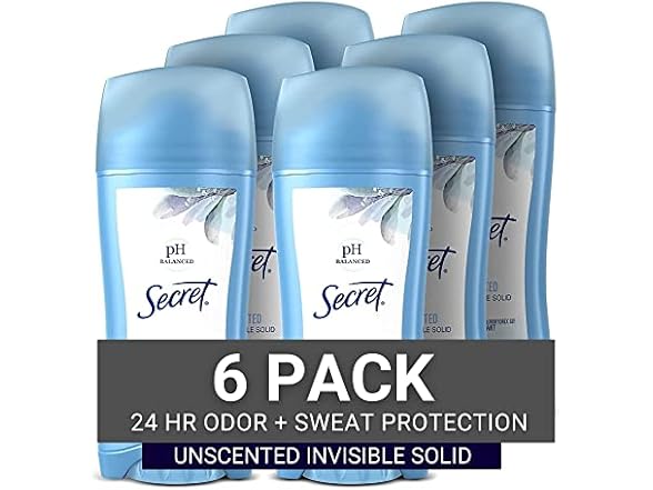 - (1) Secret Antiperspirant and Deodorant Women, Original Unscented Invisible Solid, pH Balanced, 2.6 Oz (Pack of 6)