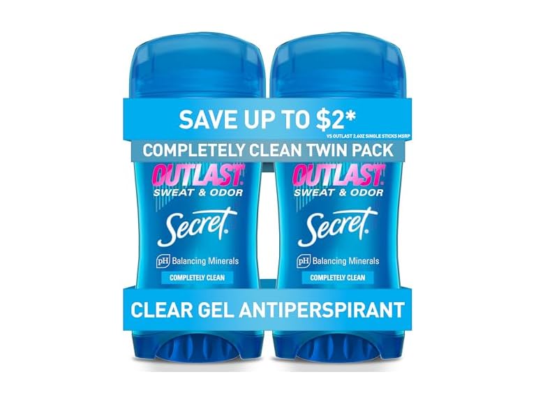 - (1) Secret Outlast Antiperspirant Deodorant for Women, 72hr Sweat & Odor Protection, PH Balancing Minerals, Clear Gel, Completely Clean Scent, 2.6 oz (Pack of 2)