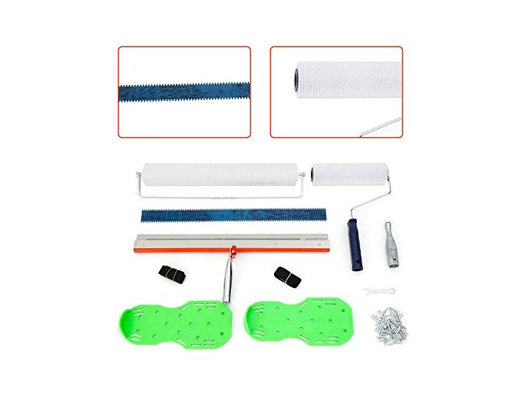 - 【Package Includes】1x Non-Marking Serrated Applicator Scraper,1x long roller brush,1x short roller brush,1x self-leveling spikes shoes.