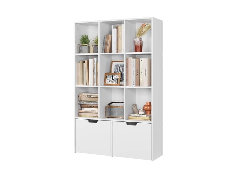 - (1) Senfot White Bookshelf 9 Cube, Modern Bookcase Storage Cabinet with 2 Large Drawers, Free Standing Storage Organizer Book Shelves for Living Room, Office, Study