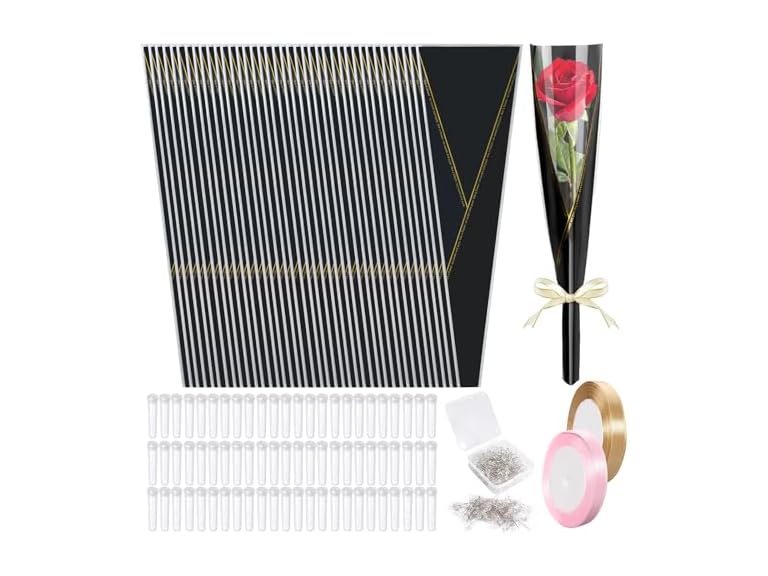 - High-Quality Materials: Made from sturdyand waterproof OPP material, the single rose packaging sleeves keep your flowers secure and fresh. The transparent plastic tubes and pins add a refined touch, while the silk ribbon provides a smooth and luxurious look.
