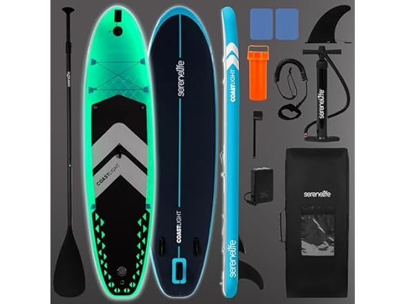 - (1) SereneLife 10’6” Inflatable Stand-Up Paddle Board with LED Lights - 32” Wide Stable Design with Non-Slip EVA Deck Pad, Includes Premium SUP Accessories, for Youth and Adults, 275 lbs. Capacity