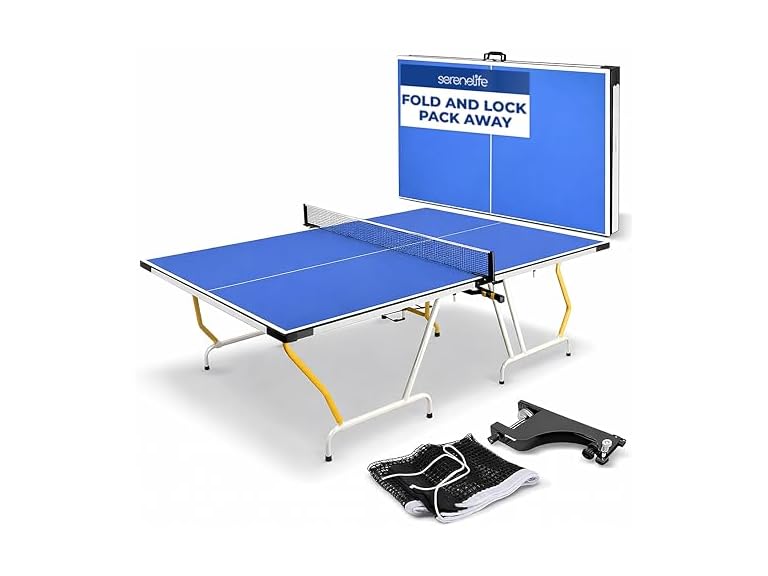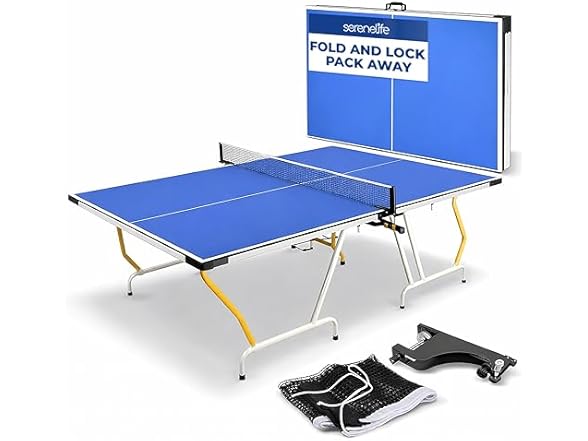 Features: Space Saving, Easy to Move and Store, Simple Clamp-on Style Design for Easy Attachment and Removal., Includes Net, Clip Set, and Post, 15mm Thick Medium-Density Fiberboard, (MDF) with UV Multi-Layer Painted Surface, Consistent and Reliable for Ball Bounce, Thick Steel Legs with Adjustable Rubber Feet Ensure a Level Playing Surface., Provide Safety During Game Play, Solo Playback, Transport & Storage Modes, What's in the Box: Post, Net, Technical Specs: Construction Material: MDF+STEEL, Net Length: 71.6" x 5.50" -inches, Playfield Board: 0.59" -inch MDF with UV Painting, Frame: H30mm Steel Frame, Leg: 0.98" -inch Diameter Support Frame Iron Tube, Surface Dimensions: 29.9" x 54.13" x 0.59" -inches MDF with UV Paint, Table Dimensions (L x W x H): 107.9" x 59.8" x 29.9" -inches, Storage Position Dimensions (L x W x H): 53.9" x 30.3" x 3.6" -inches Introducing the Midsize Portable Ping Pong Table Set, perfect for those who want to take their table tennis game on the go. This ping pong table set packs small enough to fit most SUV cargo, making it easy to transport to your favorite outdoor locations like the beach or camping trip. The table is made to withstand outdoor conditions, and has protected rubber corners, making it perfect for those who want to enjoy a game of table tennis in any weather. The fold-able design and easy to move and store feature makes it perfect for those who want to enjoy a game of table tennis without taking up too much space. Each half when folded has dimensions of 53.9" x 30.3" x 3.6". The set is designed for quick and easy assembly and disassembly, taking only 2 minutes to set up or take down, and has a designed with carry handles for easy transport. The set includes a net, clip set, and post, so you have everything you need to start playing right away, making it a complete table tennis set for your convenience.