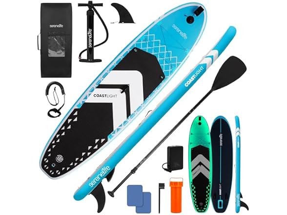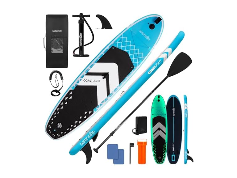 - (1) SereneLife Inflatable LED Lighted Stand Up Paddle Board 10’6” - Stable 32” Wide SUP with Non-Slip EVA Deck, Complete Paddle Kit, Double-Action Pump, Safety Leash, & Carry Backpack - 275 lbs Capacity