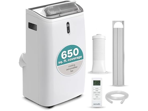 - (1) SereneLife Portable Air Conditioner, 14000 BTU (ASHRAE) Compact Home A/C Cooling Unit with Built-in Dehumidifier and Fan Modes, Energy Efficient 400 Sq. Ft. Coverage, Includes Window Mount Kit (White)