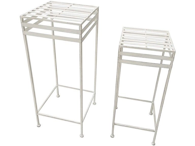 Sturdy and beautiful, these antique white plant stands are perfect for creating ornamental displays. Larger stand measures 11.5 L x 11.5 W x 27.5 H. Smaller stand measures 9.75 L x 9.75 W x 23.5 H. Made of iron to provide many seasons of pleasure.