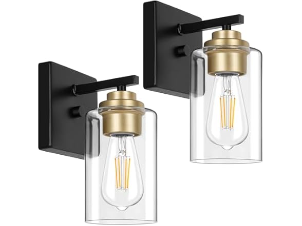 In the Box: (1) Set of 2 Wall Sconces for Bathroom, Modern Vanity Light Fixtures, Black and Gold Wall Mount Lighting Lanterns, Farmhouse Wall Lights with Clear Glass Shade