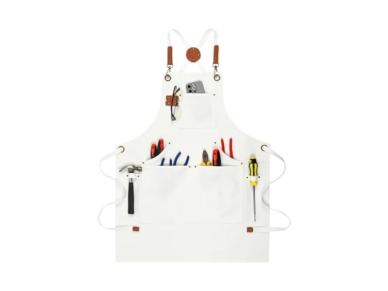- Seven uncles Handmade Work Apron with Multiple Reinforced Pockets Cotton Canvas Adjustable Cross Back Weight Apron (White)